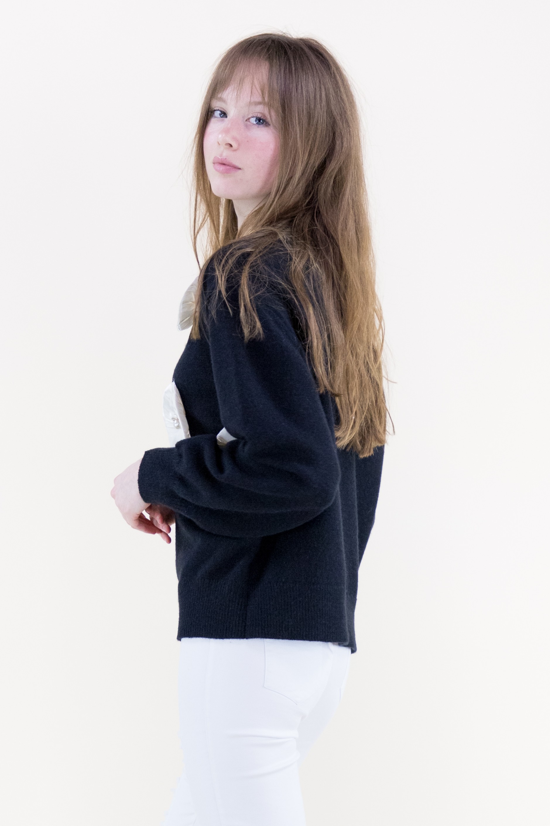 Product Description - Round neckline - Long sleeves - Rib knit hem and sleeve cuffs - White flower embellishments - Soft sweater knit