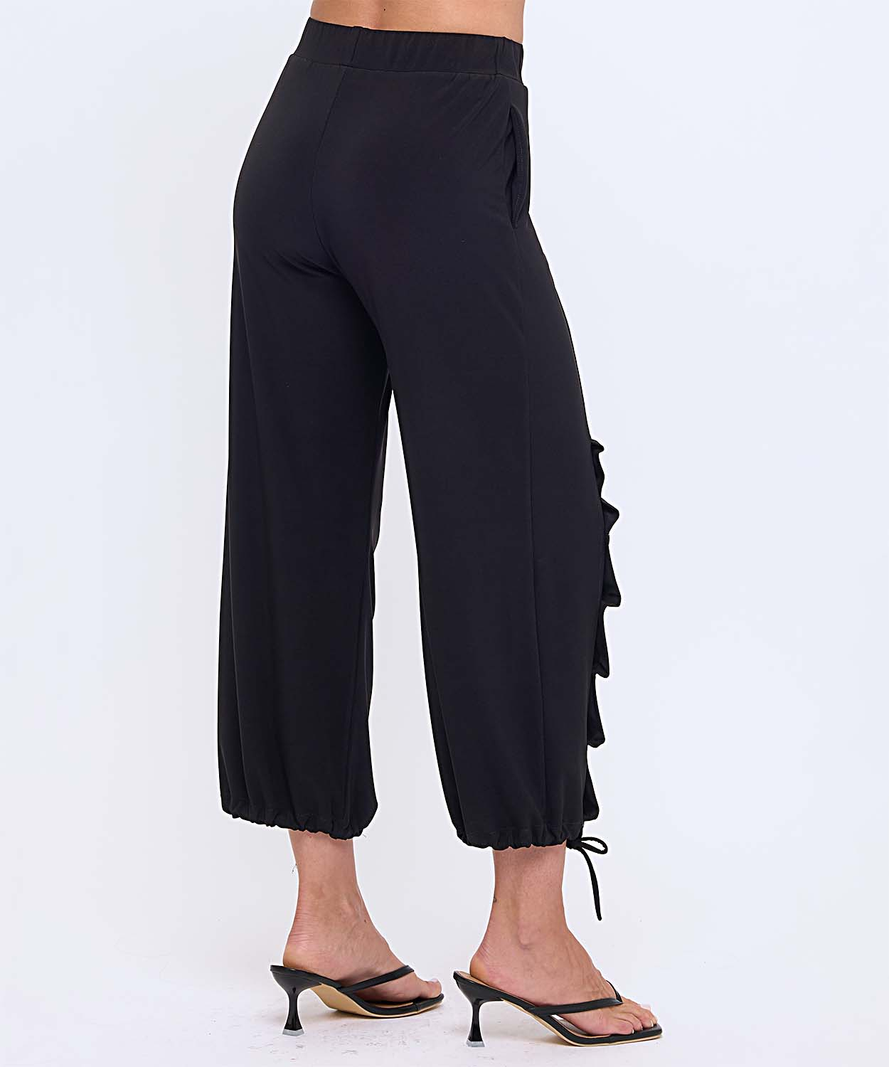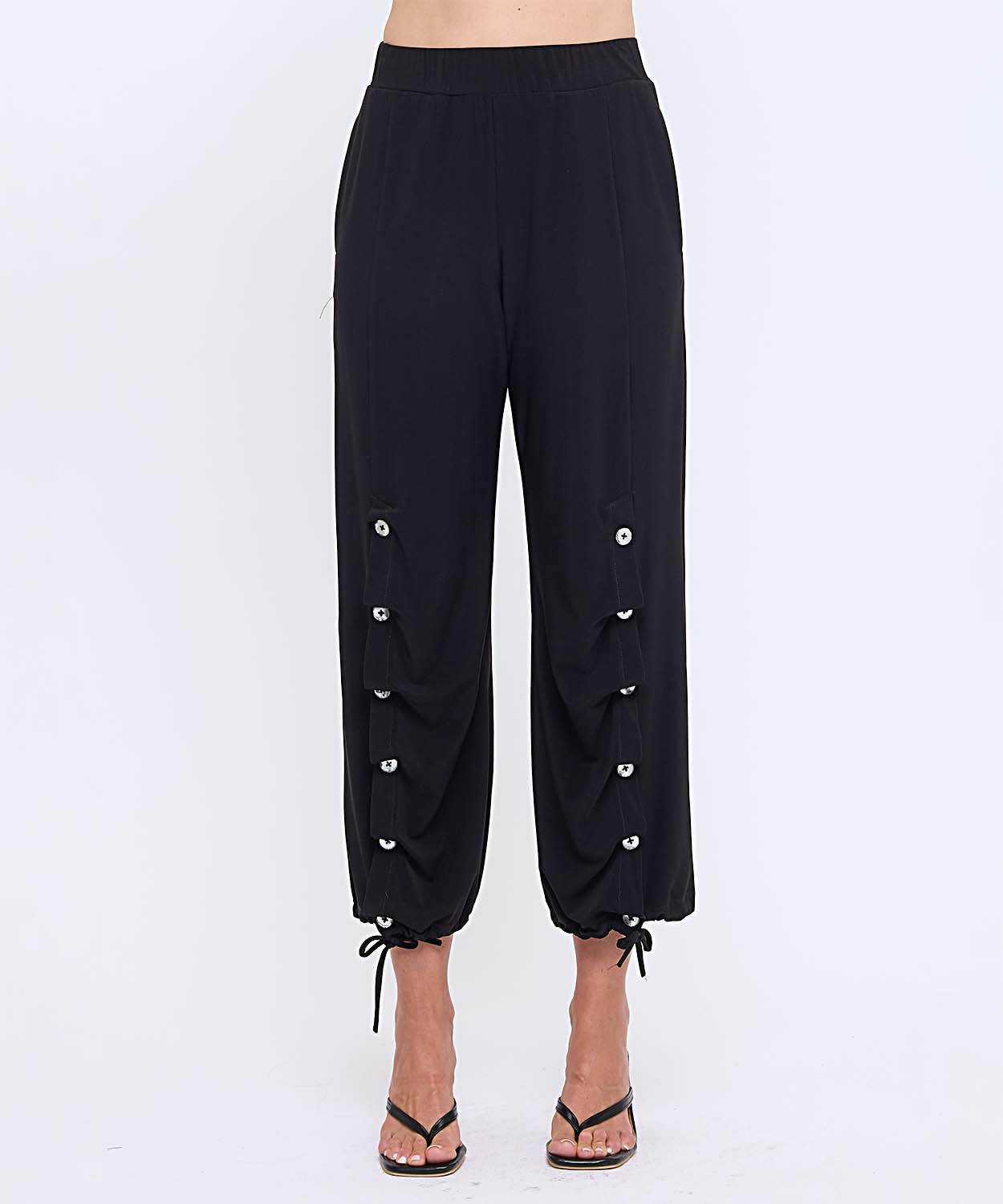 Product Description - Ankle Ties - Pockets - Buttons Down The Front - Elastic Waistband - Materials: 92% Polyester 8% Spandex