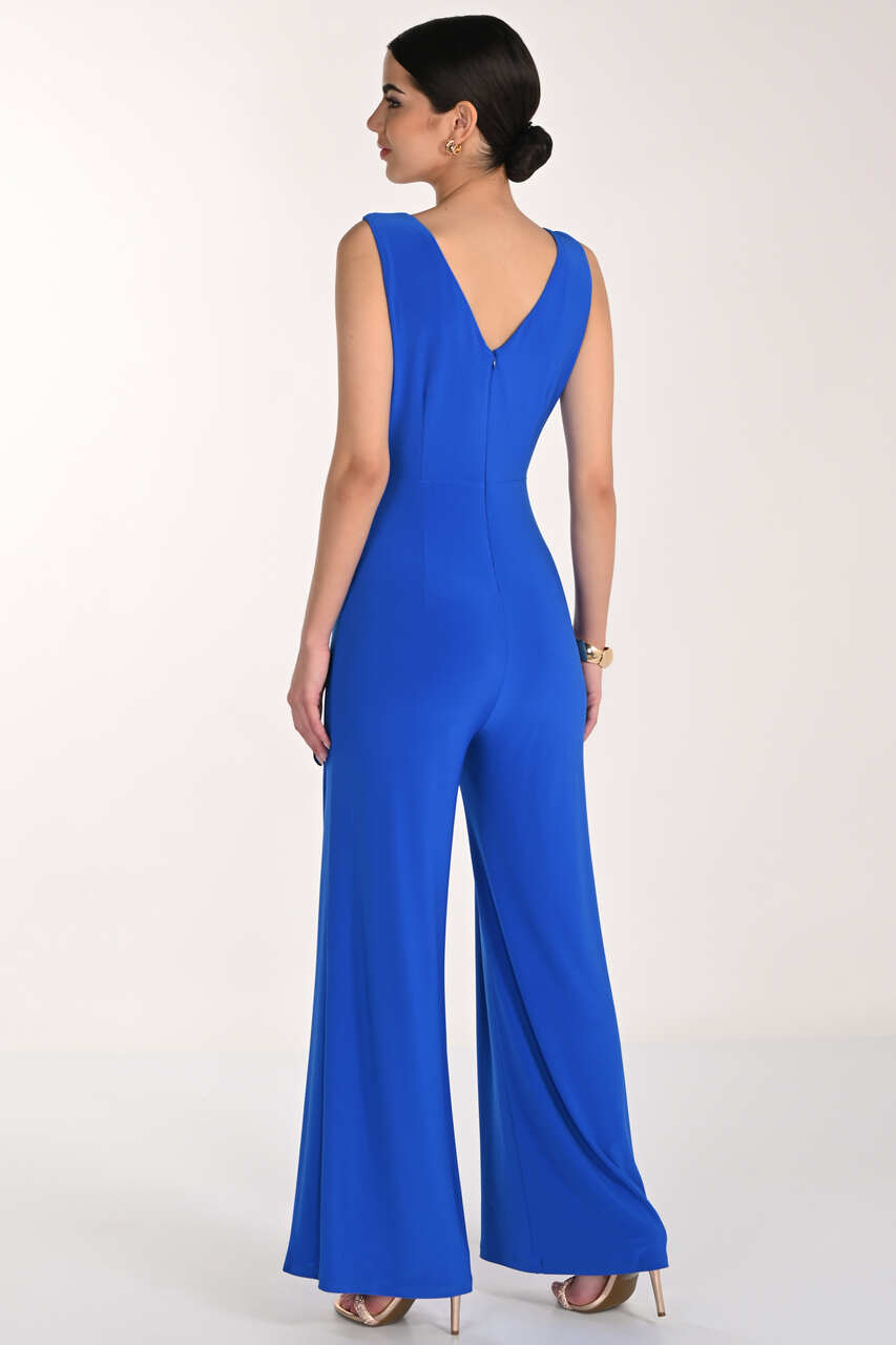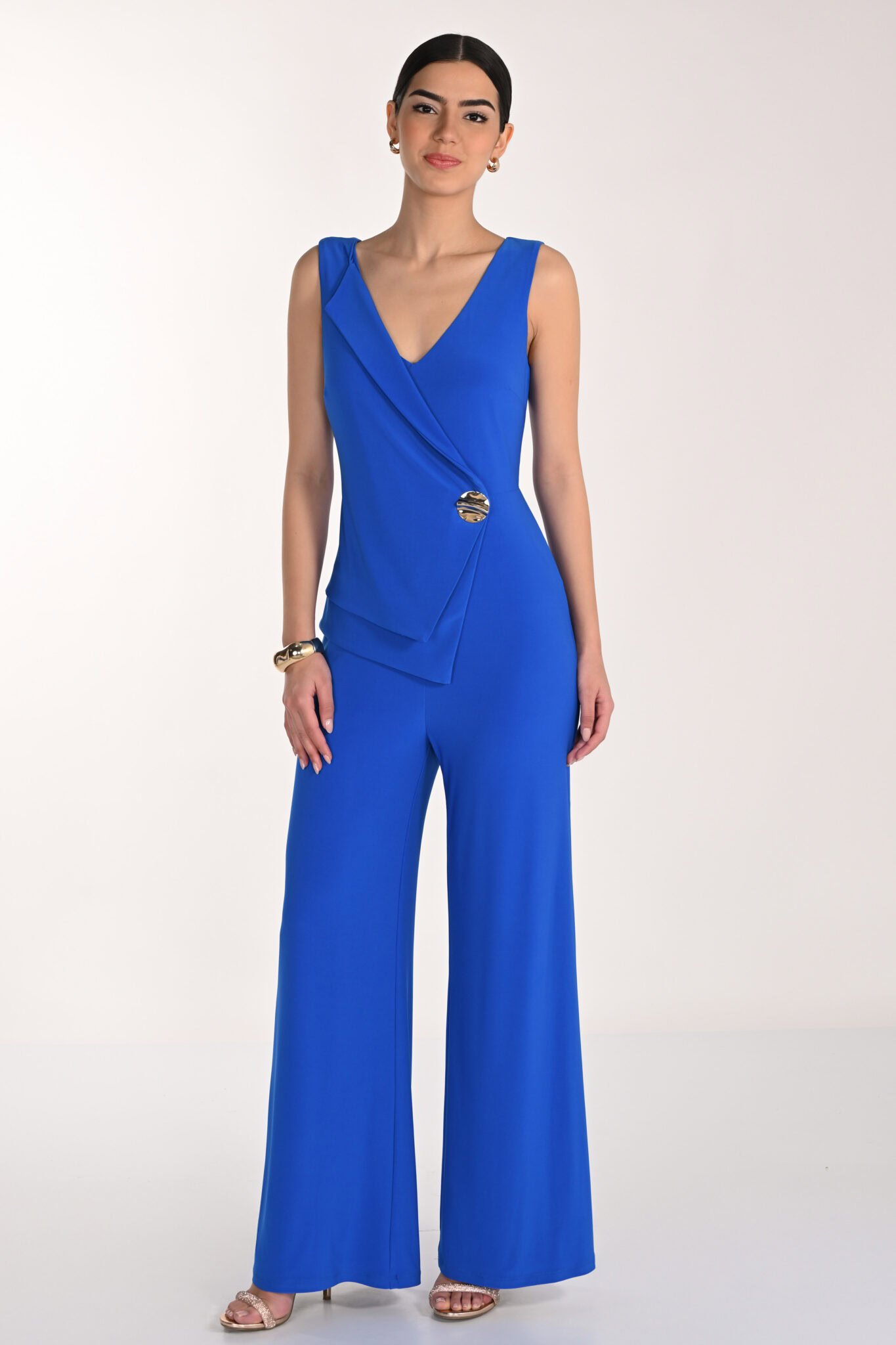 Product Description - V-neckline (front and back) - Sleeveless - Wrap effect bodice with statement button - Wide leg pants