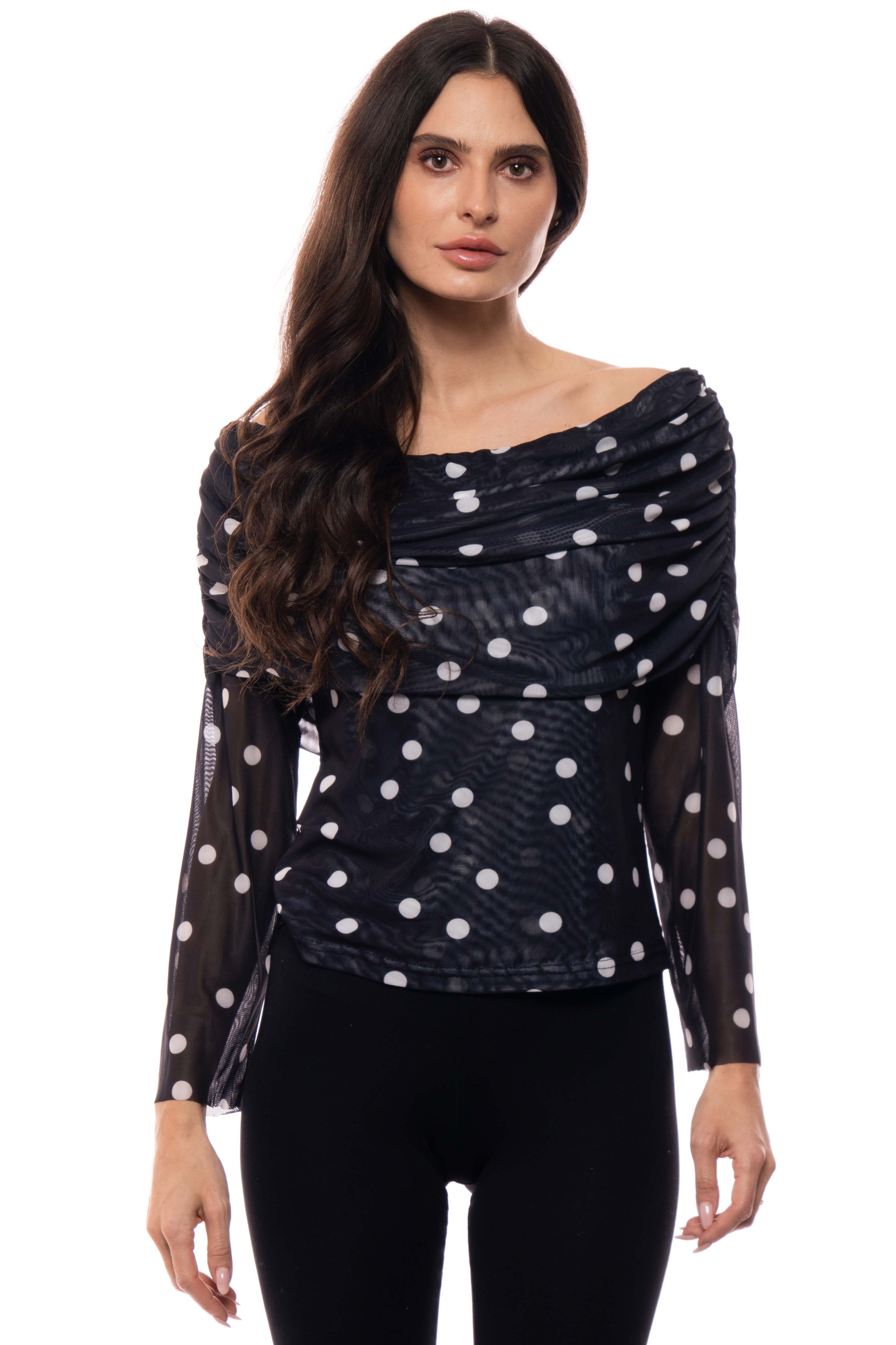 Product Description - Draped boat neckline - Long sleeves - Sheer mesh sleeves - Double layered mesh bodice - Polka-dot print