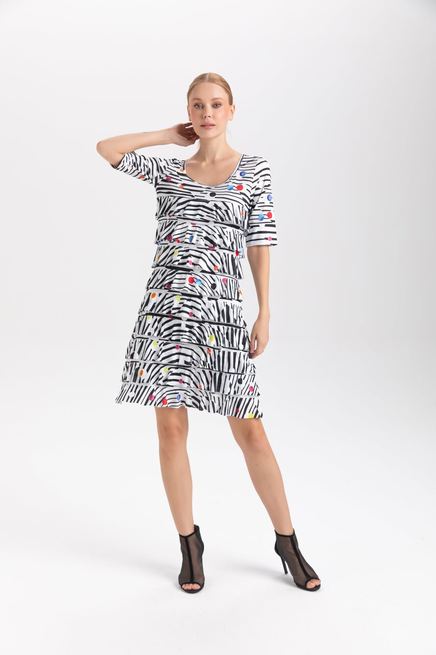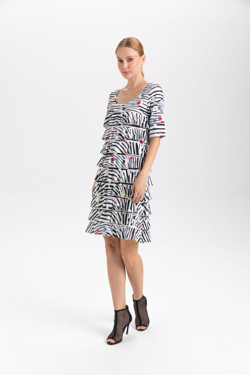 Product Description - Scoop neckline - 1/2 length sleeves - Tiered ruffles - Above-the-knee hem - Multicolor polka-dot animal print