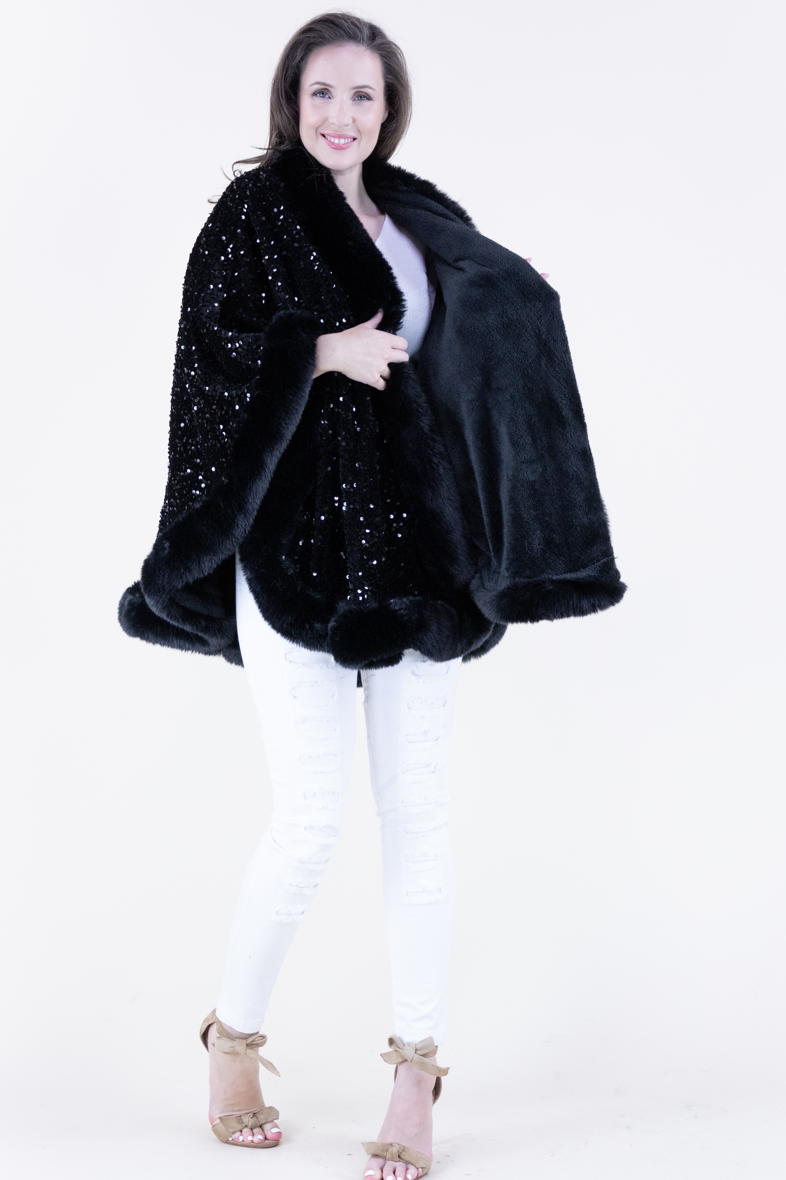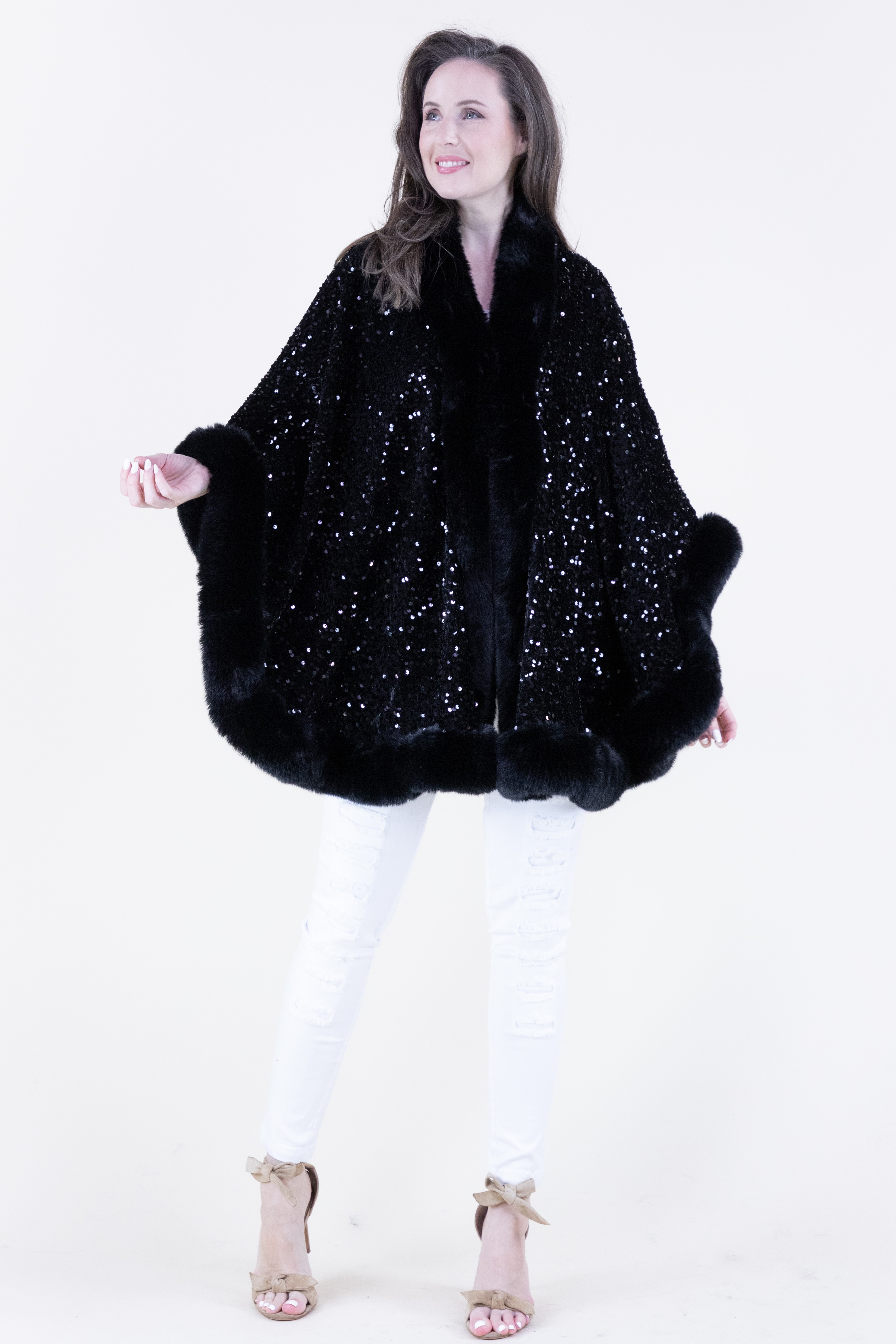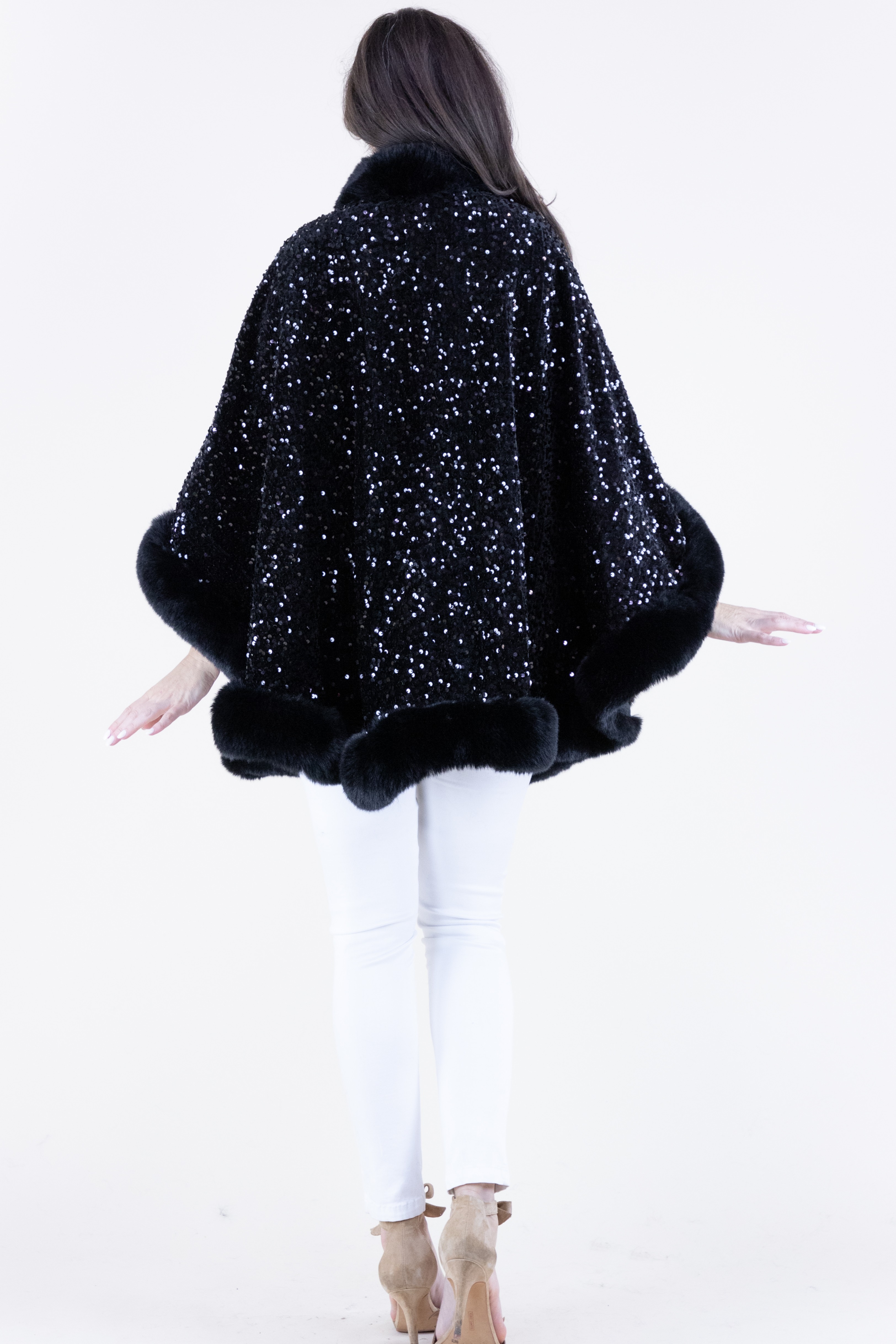 Shennel Trading View Details Sequins Faux Fur Trim Poncho Sale Price $149.00 - Faux fur neckline - Sequins fabrication - Faux fur trim