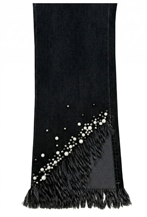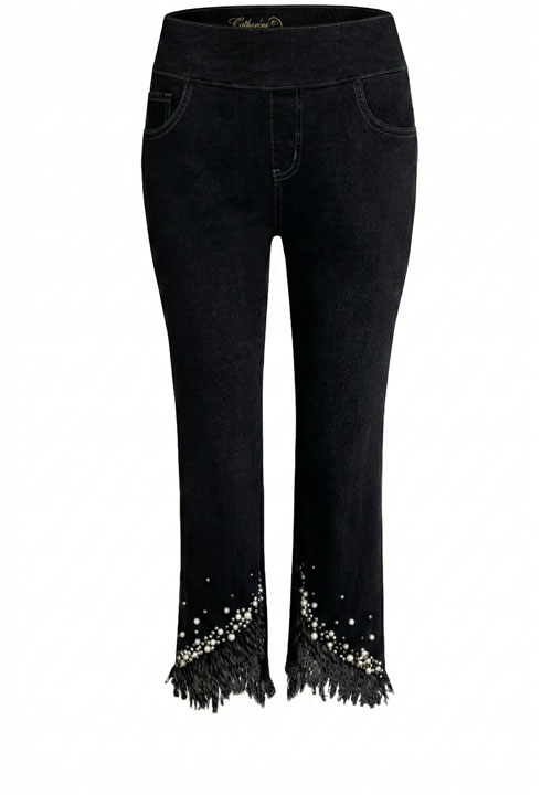 Product Description - Zipper and button fly - Front and back pockets - Fringe hem with pearl embellishments - Great stretch - Inseam 27" - Materials: 63% Cotton, 18% Polyester, 17% Viscose, 2% Spandex