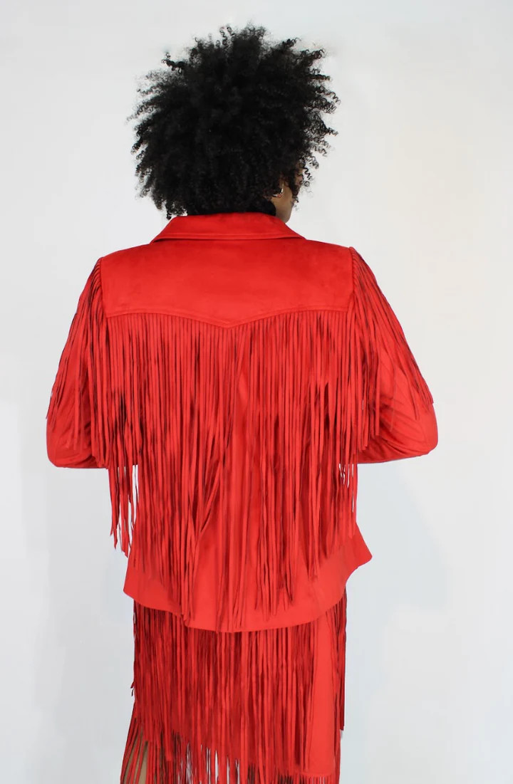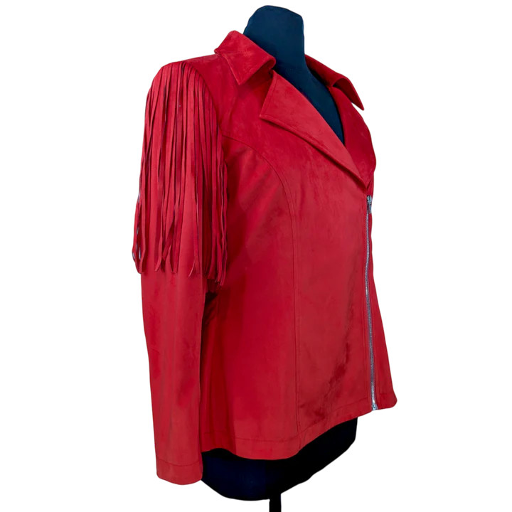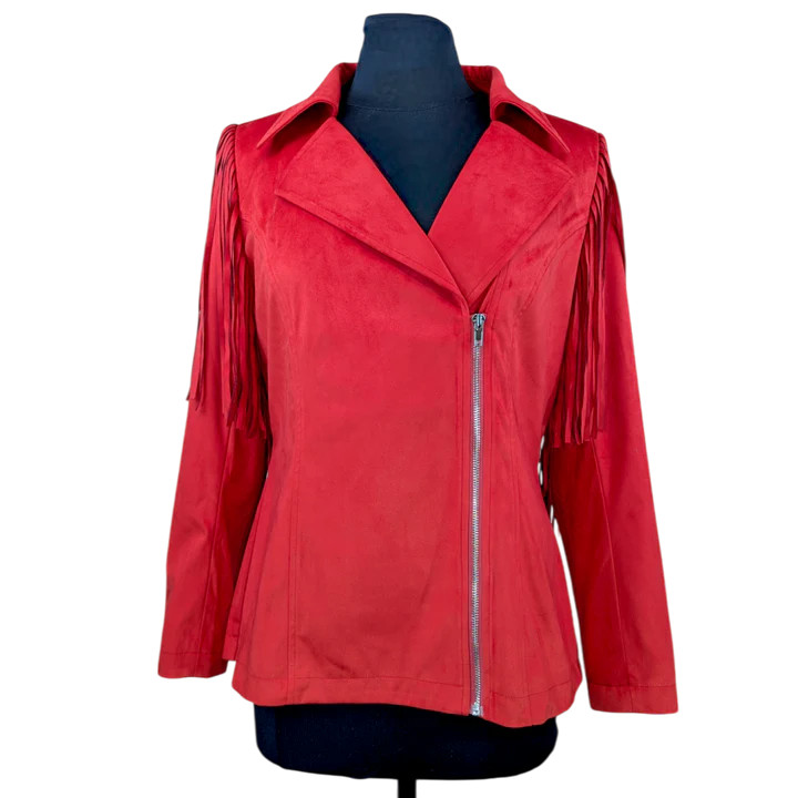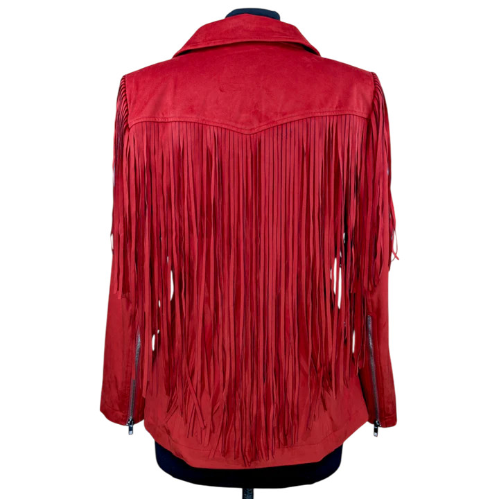 Product Description - Asymmetric front zipper - Classic notched lapel - Long sleeves with zipper detail - Fringe shoulders and back