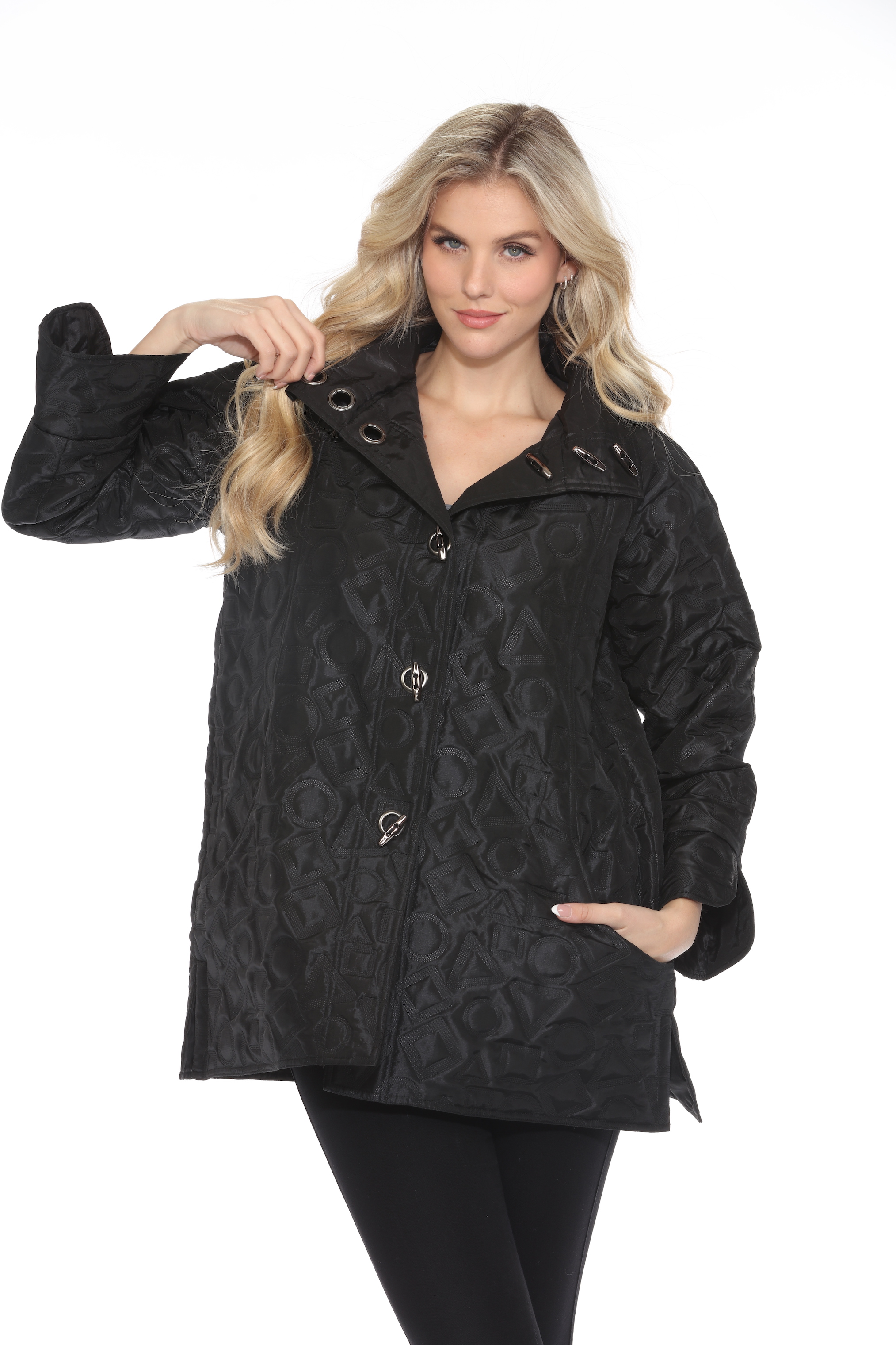 Lindi View Details Blue Geometric Puffy Print Toggle Coat Sale Price $192.00 - Toggle button closures - Long sleeves with flare cuffs - Pockets
