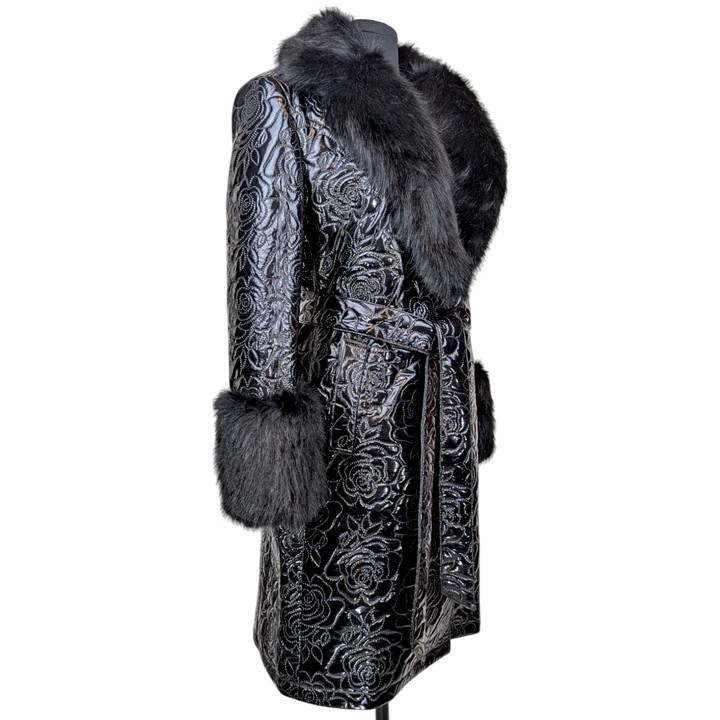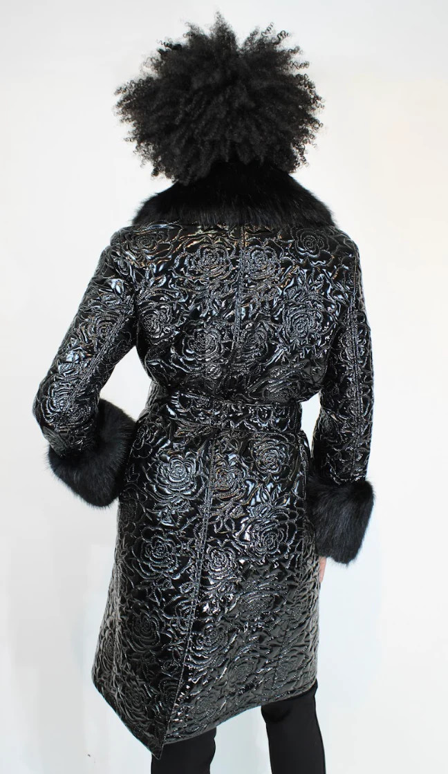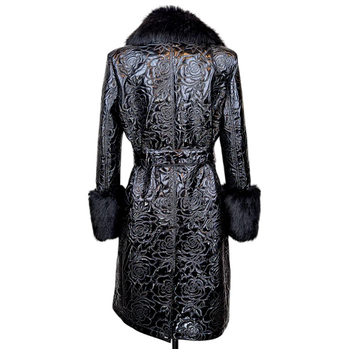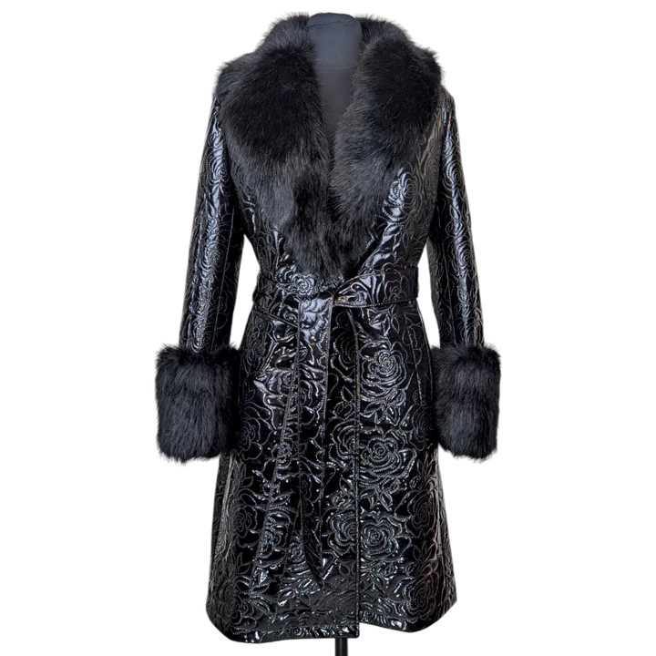 Product Description - Faux fur neckline and sleeve cuffs - Waist tie belt - Pockets - Glossy floral embossed body