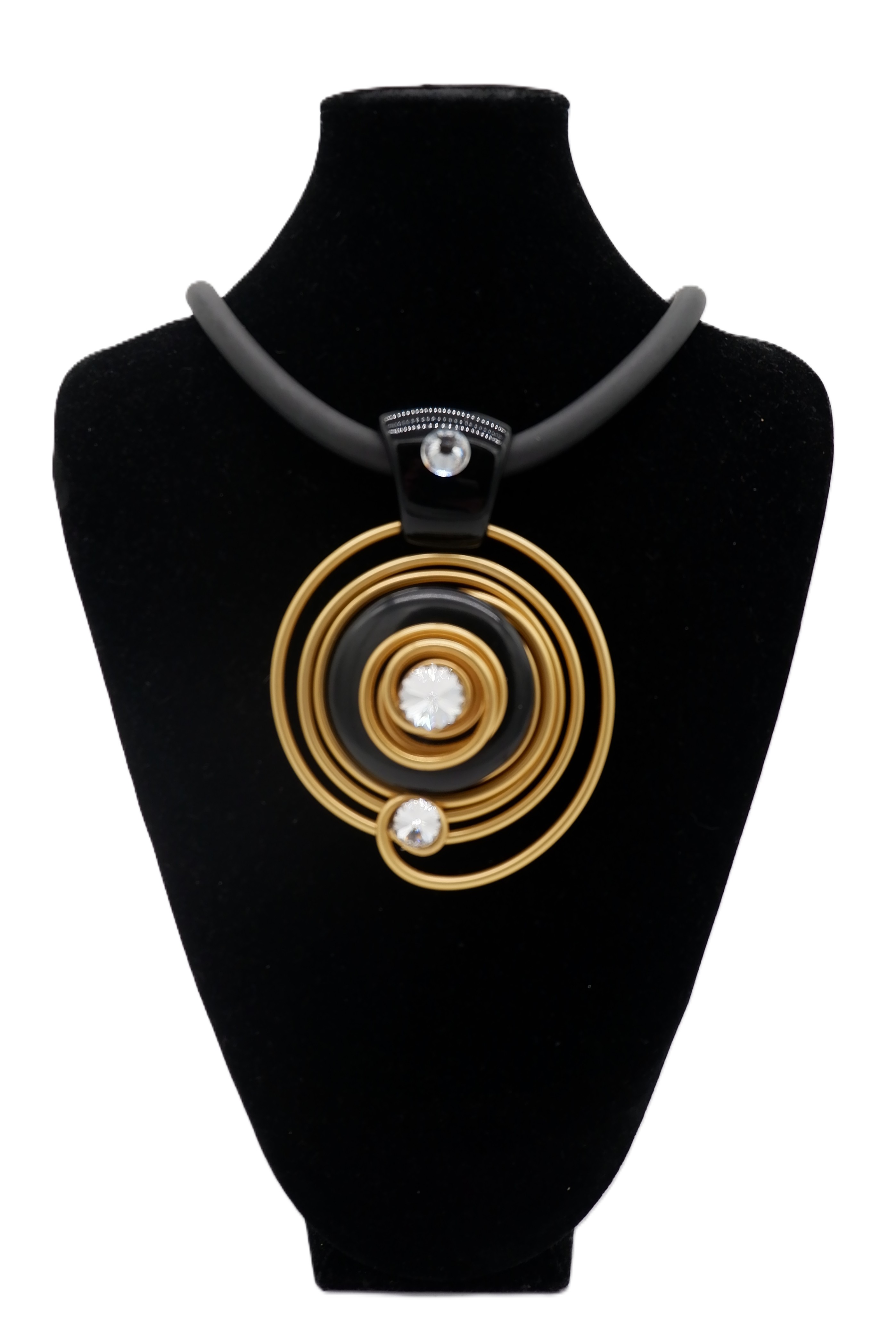 Jeff Lieb Add to Cart Golden Spirals Rubber Statement Necklace SKU 29592 Sale Price $159.00 - Genuine Swarovski Crystals - Soft, Thick Rubber Necklace with Magnetic Closure - Made in USA