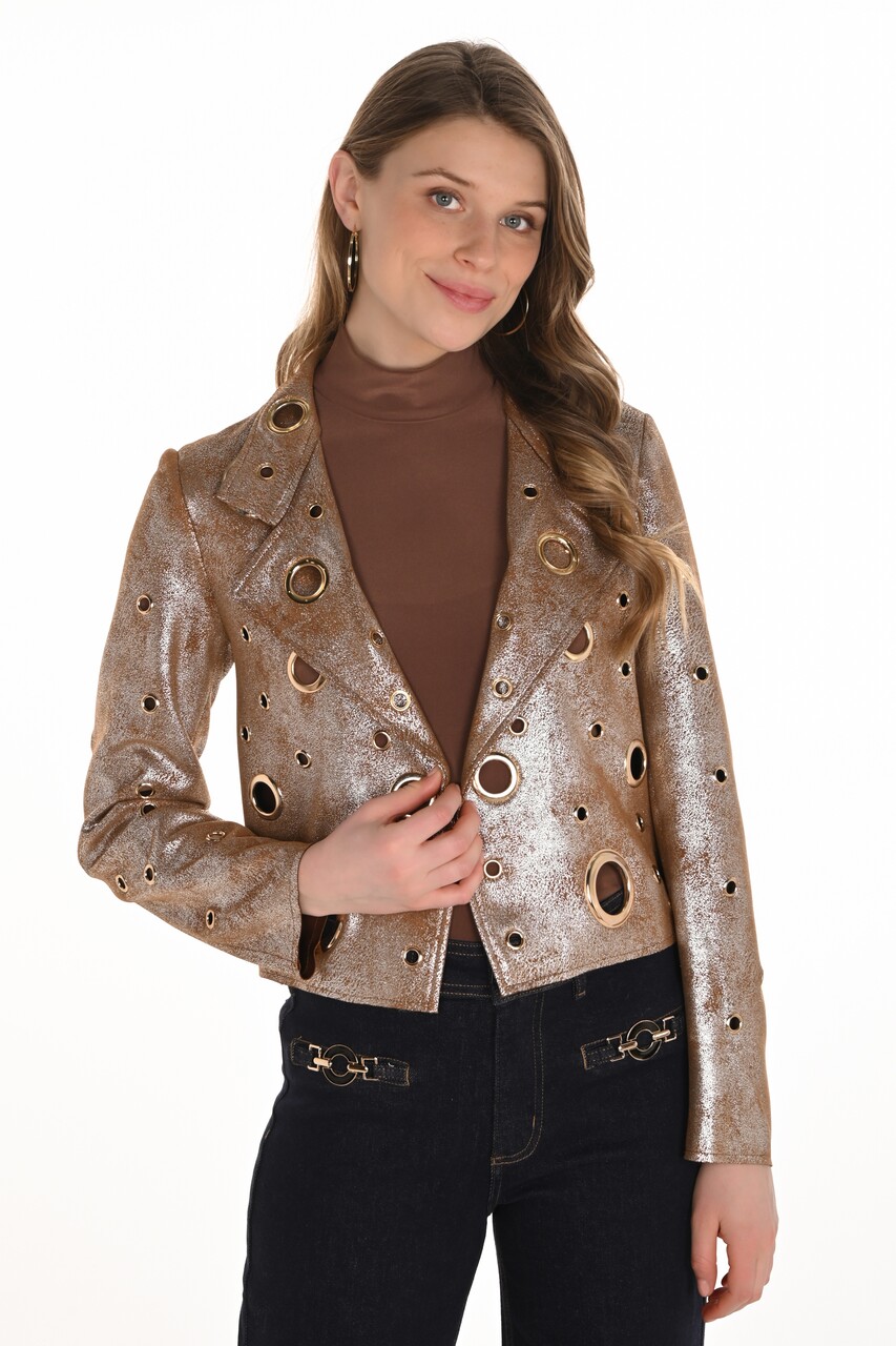Product Description - Notched collar - Open front - Metallic sheen - Grommet details (front & sleeves only) - Long sleeves