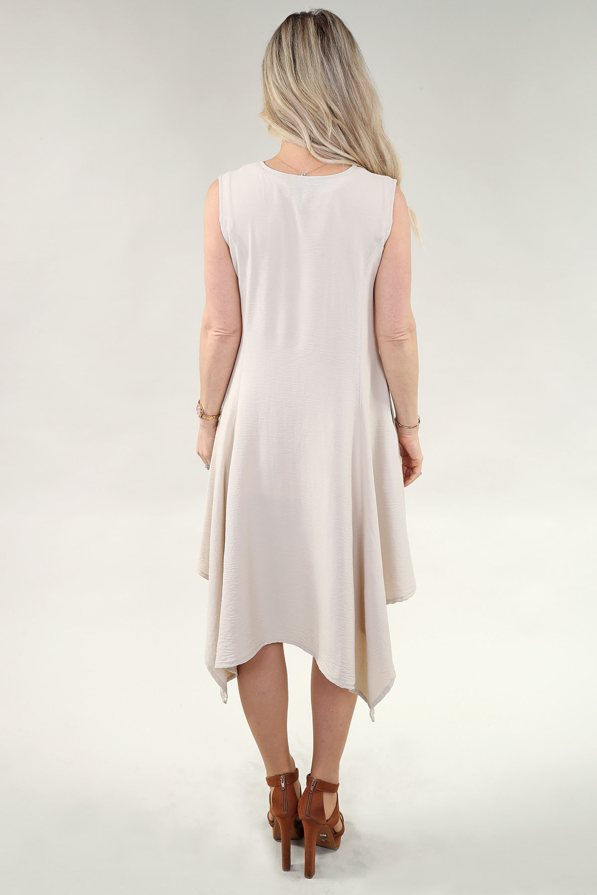 Product Description - Round neckline with v-cut - Sleeveless - Pockets - Asymmetrical draped hem - Materials: 100% Viscose