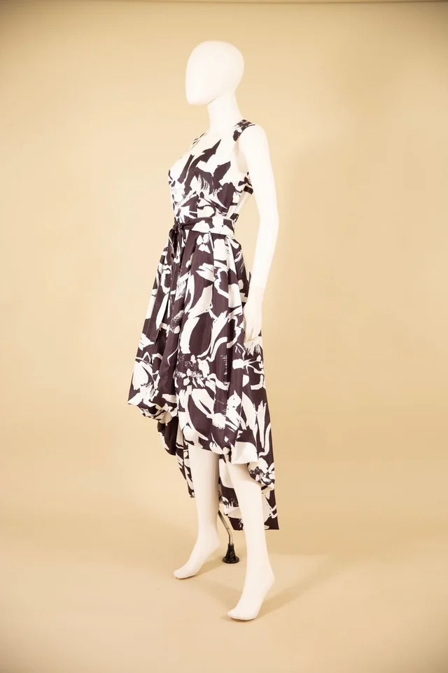 Product Description - Print duppioni fabric - High-low hem - Bubble dress - Sweetheart neckline - Self-belt