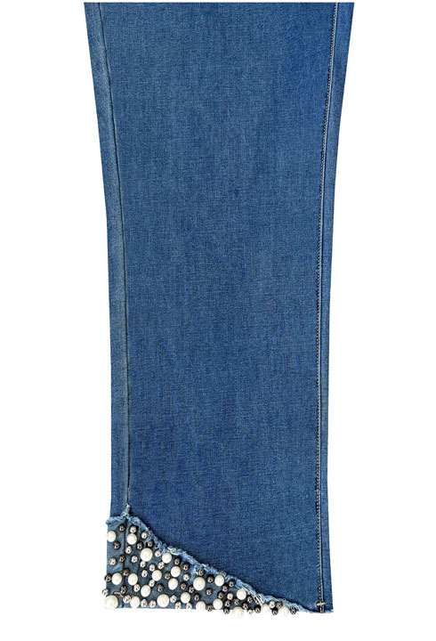 AZI Jeans View Details Pearl Embellished Jeans Sale Price $164.00 - Zipper and button fly - Front and back pockets - Faux pearl embellished hem
