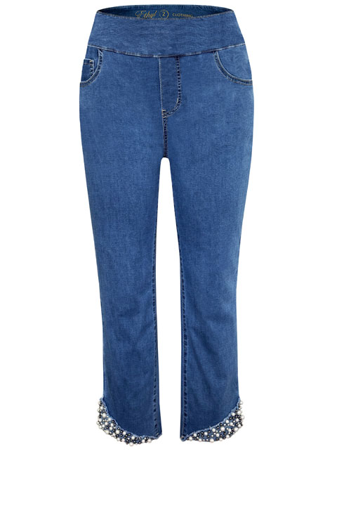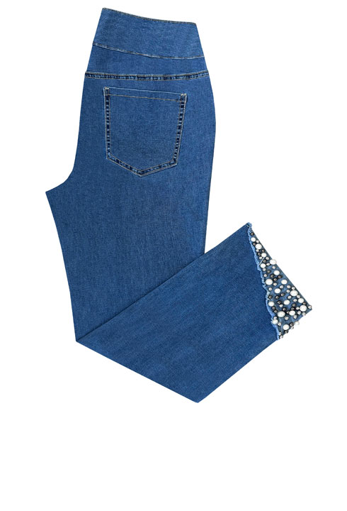 Product Description - Pull-on waistband - Faux pearl trim hem - Front and back pockets - Great stretch - Inseam 25" - Materials: 72% Cotton 25% Polyester 3% Spandex
