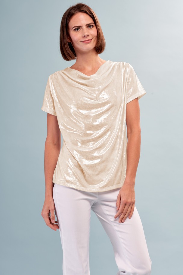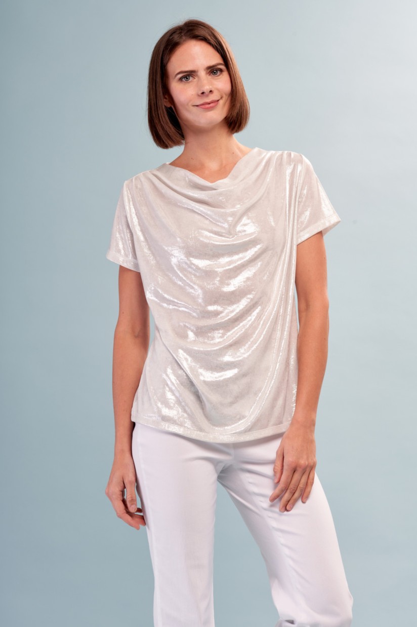 - Draped cowl neckline