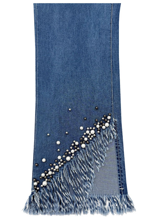 Product Description - Flat pull-on waistband - Cropped length - Fringe and pearl applique - Great stretch - Inseam 27" - Materials: 68% Cotton 25% Polyester 5% Rayon 2% Spandex