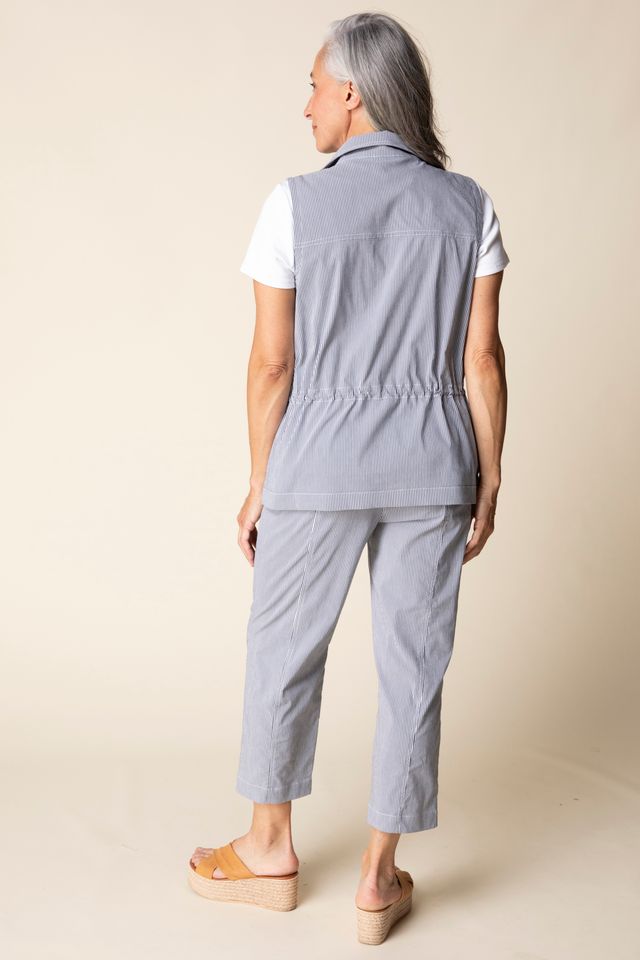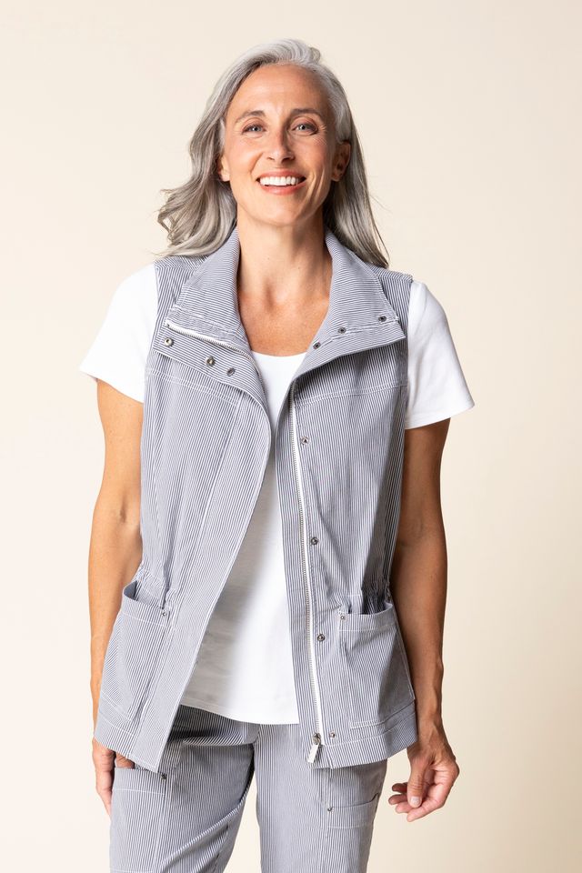 Product Description - Zipper closure - Snap button closures - Front pockets - Sleeveless - Pinstripe print