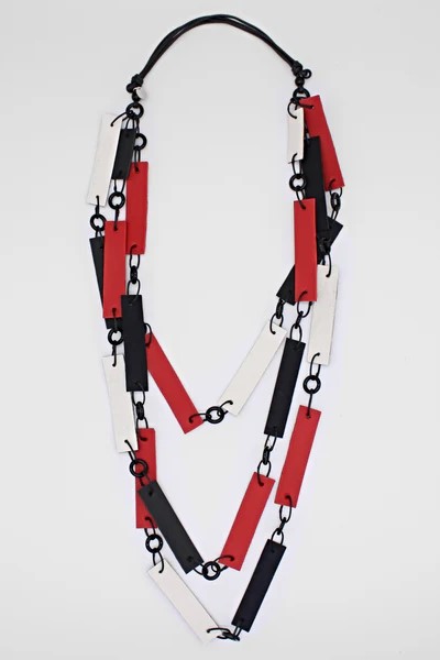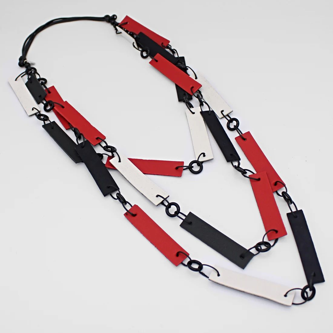 - Thin black wax cord accented with rectangular leather pieces in red, black and white