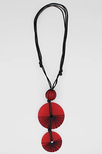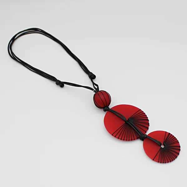 - Two red round resin beads intricately wrapped in black thread