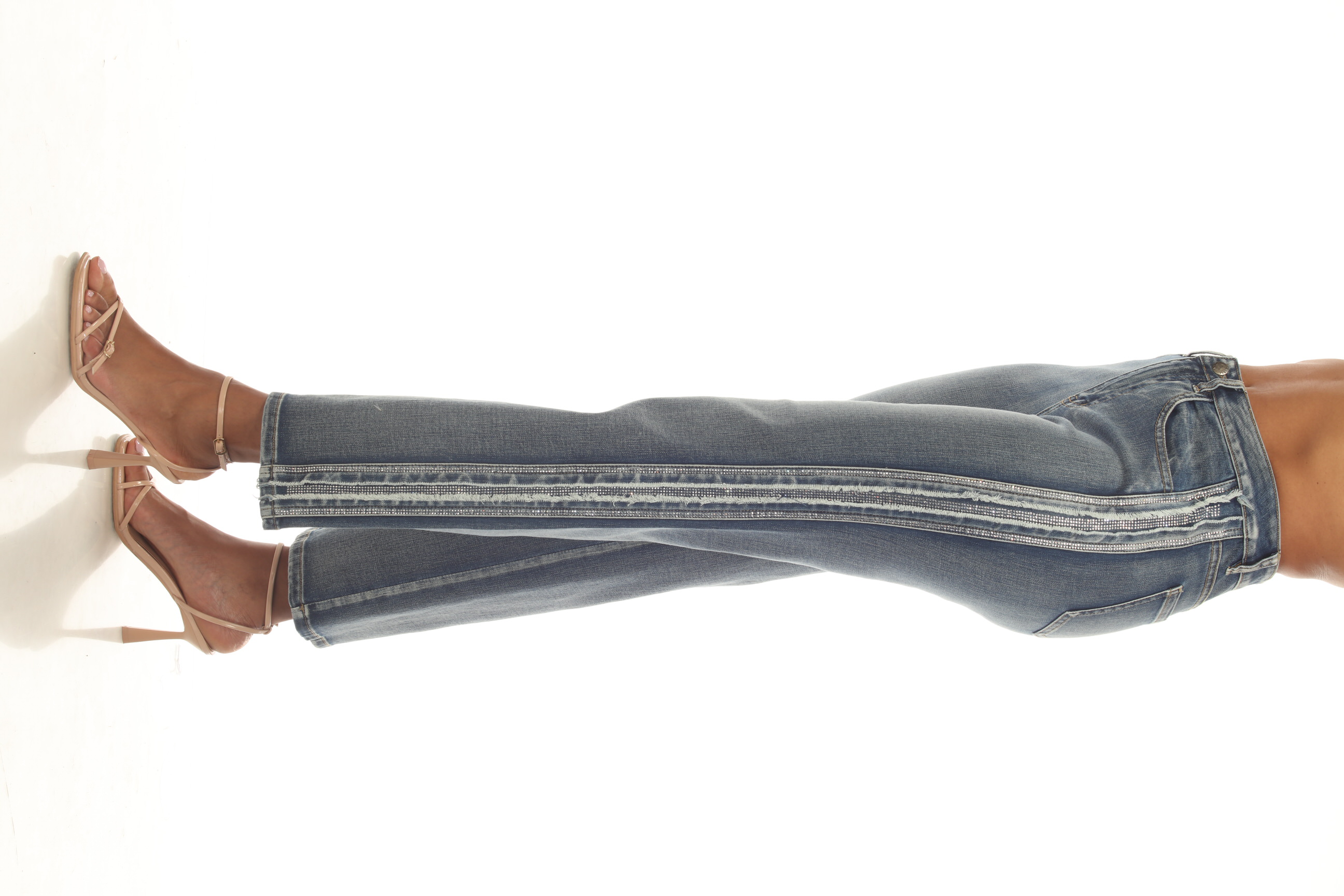 Product Description - Zipper and button fly - Front and back pockets - Side band with rhinestone detail - Straight leg fit