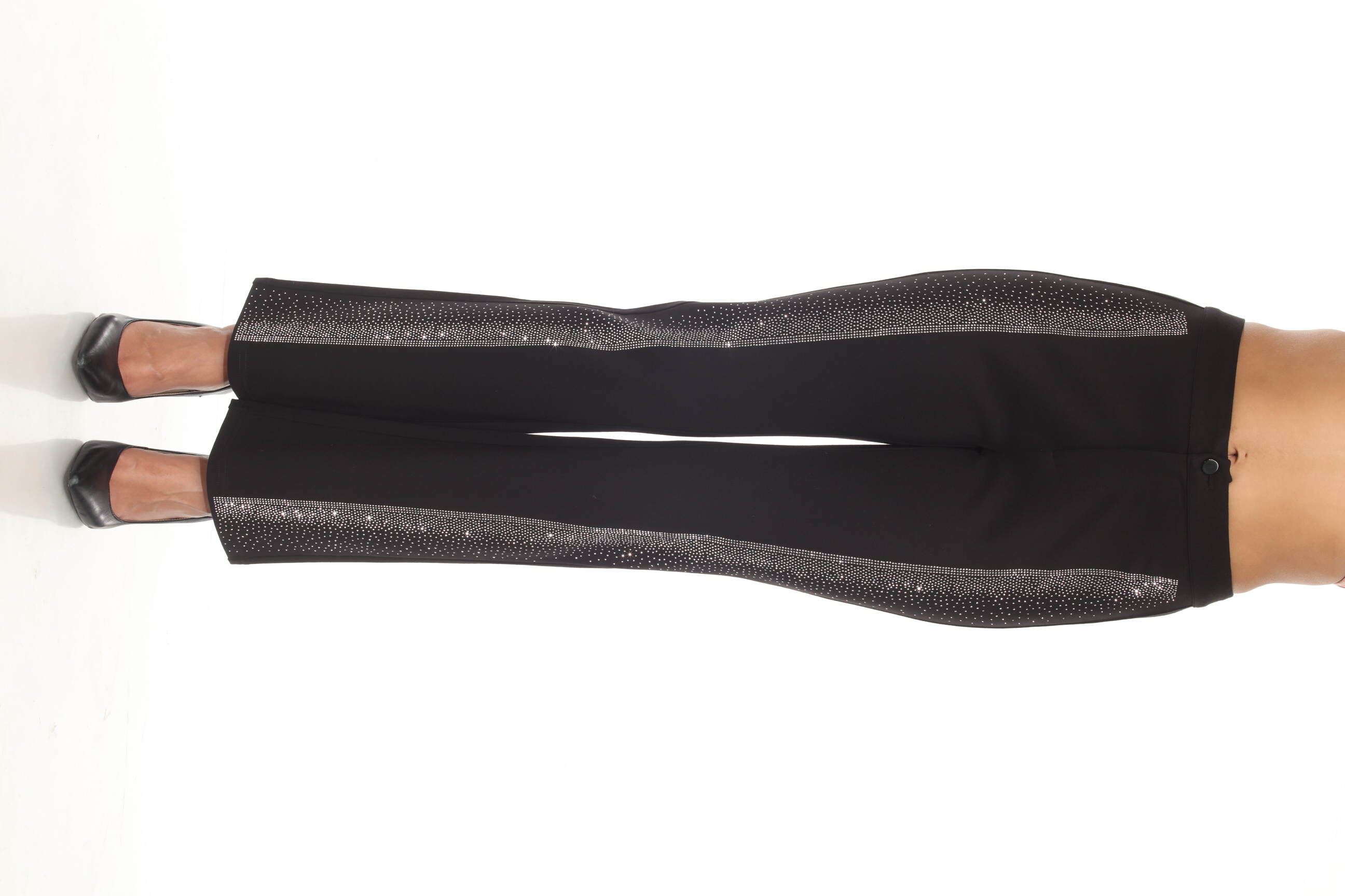 Product Description - Zipper and button fly - Cascading rhinestone applique - Slight flare silhouette