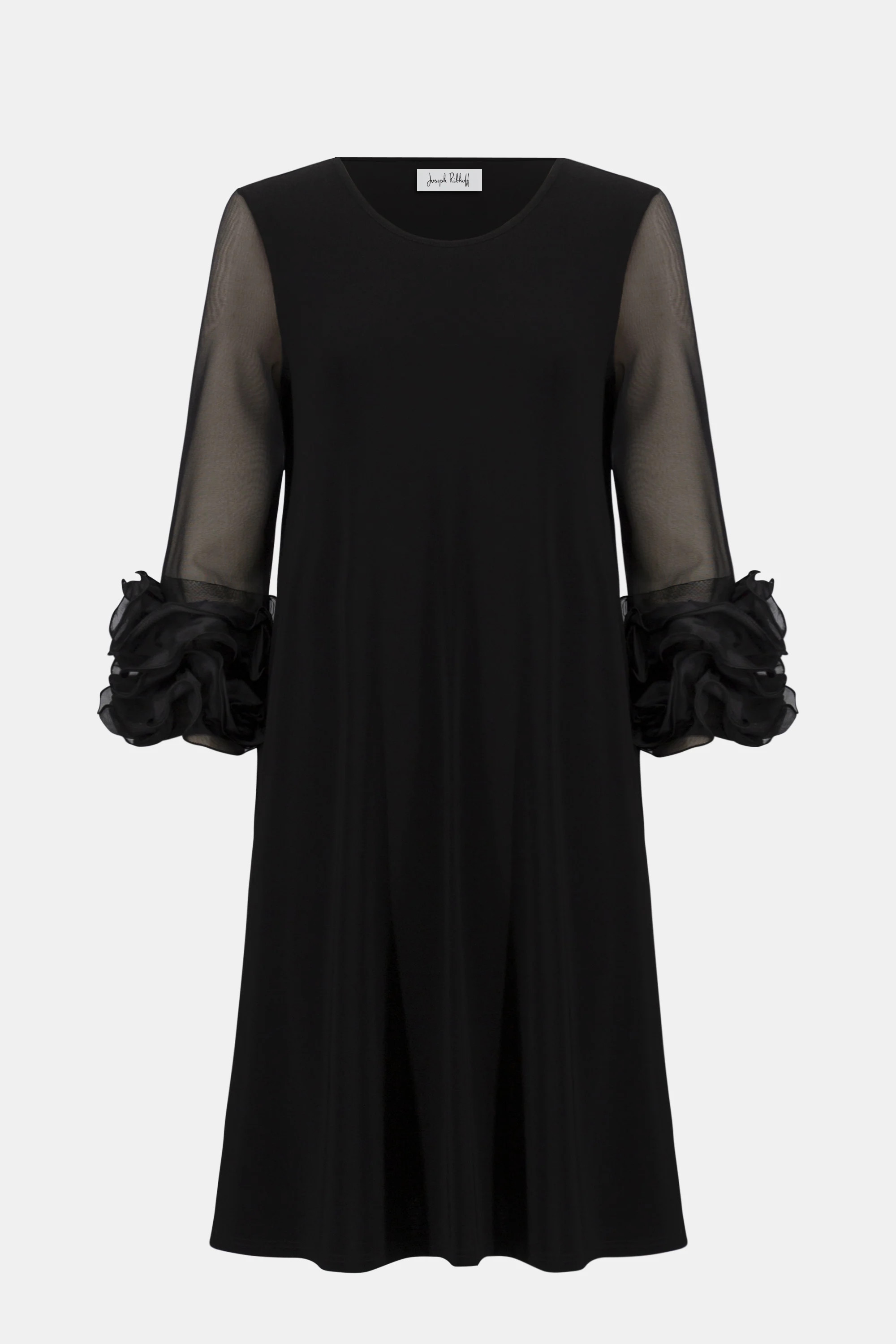 - Three-quarter bell sleeves with ruffled trim