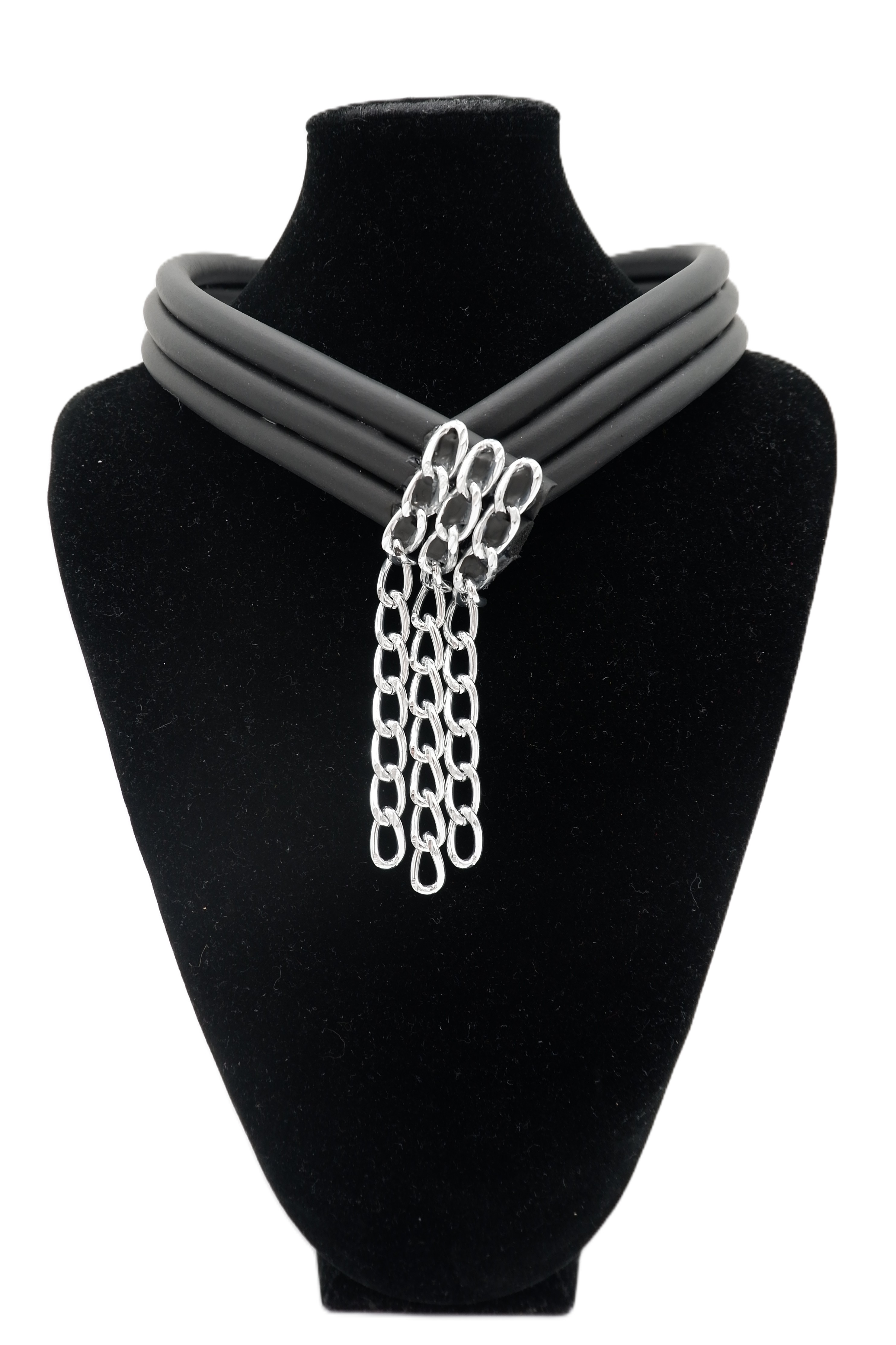 Jeff Lieb Add to Cart Silver Chain Link Multi-Strand Rubber Necklace SKU 30729 Sale Price $139.00 - Genuine Swarovski Crystals - Multi-strand Thick Rubber Necklace with Magnetic Closure at the front…