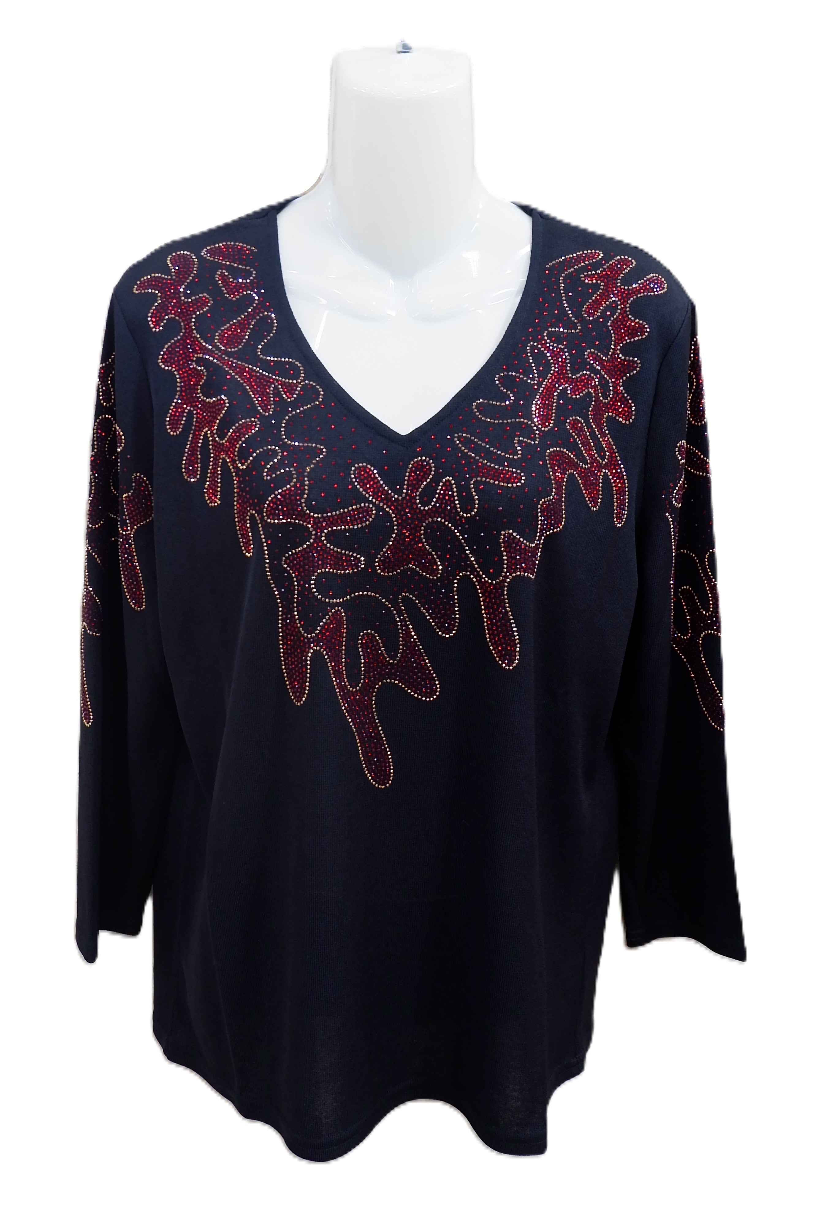 Product Description - V-neckline - Long sleeves - Rhinestone neckline embellishments - Cotton knit fabric