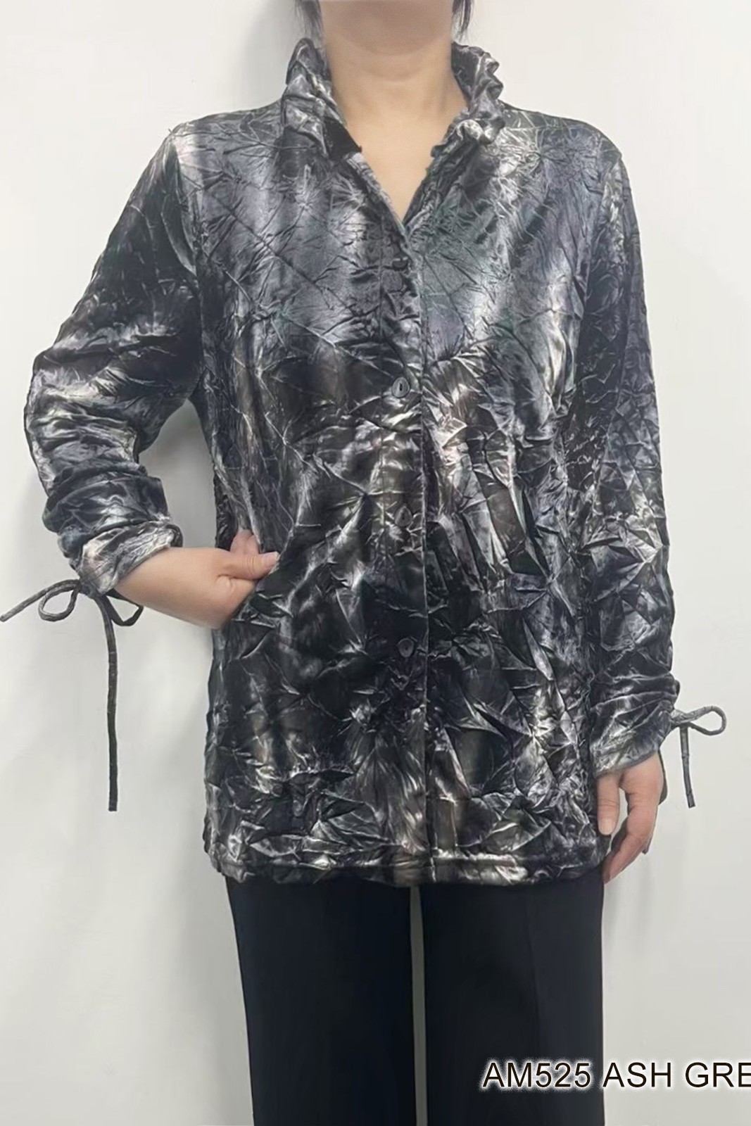 Product Description - Button closures - Ruffle stand-up collar - Long sleeves with ties - Crinkled, soft velvet fabric
