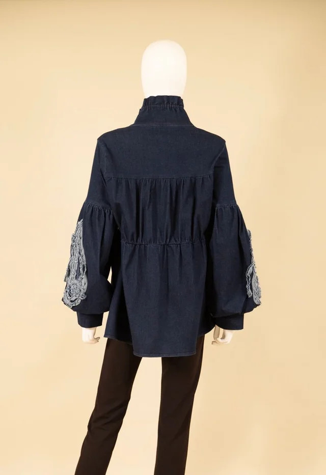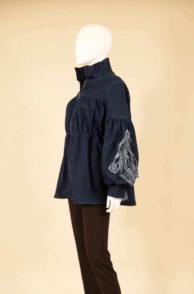 - A-line denim jacket with 3D flower on sleeve